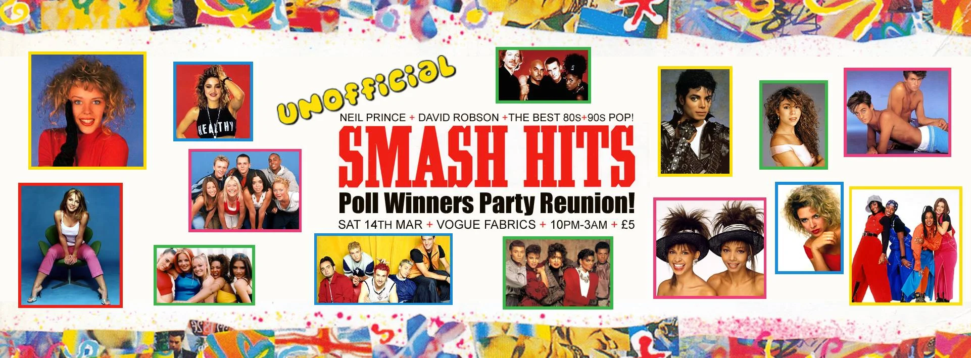 The 2015 (Unoffical) Smash Hits Poll Winners Party – LIVE From VogueFabricsDalston. Neil Prince and David Robson invite you to ‘Step Back in Time’ and join them for a night of unapologetic pop pleasure.