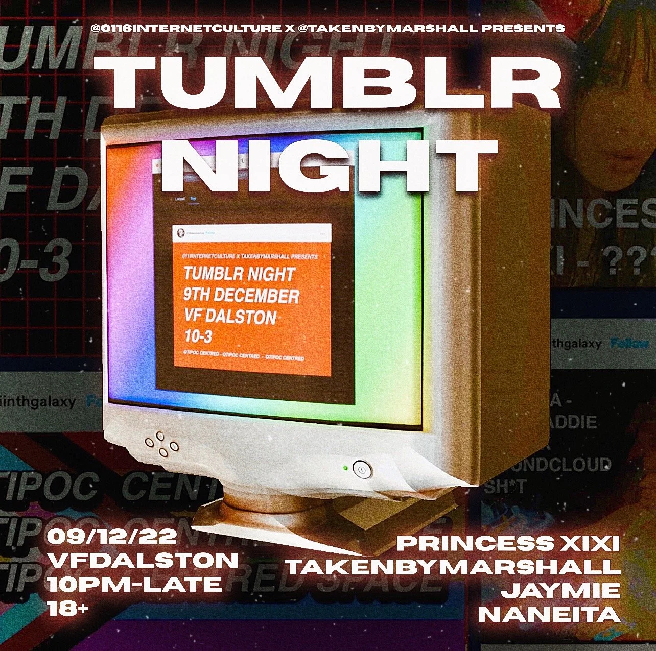 ITS TUMBLR NIGHT BABY! Get ready to dance to Lorde or scream to Twenty one pilots as we’re taking you back to the tumblr 10’s. QTIPOC KIDS never felt at home in tumblr spaces due to how white & heteronormative these spaces were. So we want to take back our nostalgia and reclaim the party back. Expect to hear all your fave indie pop tumblr bops such as halsey, the 1975, lana del ray, troye Sivan, wallows, arctic monkeys, Melanie Martinez & so much more.